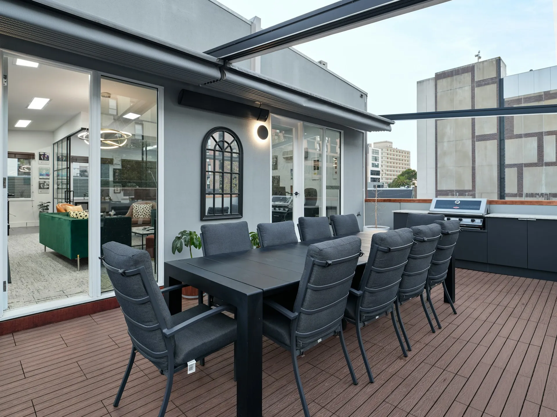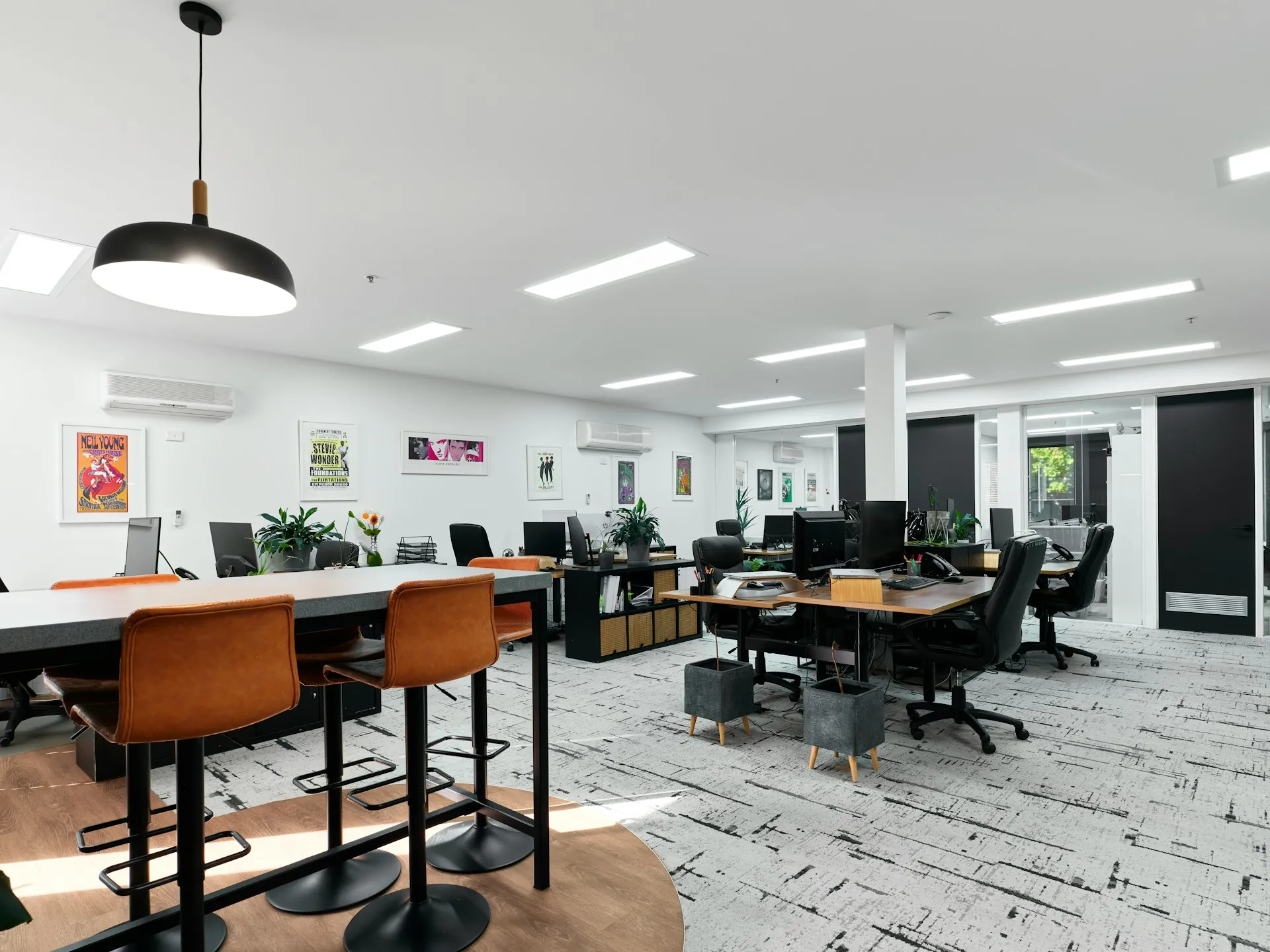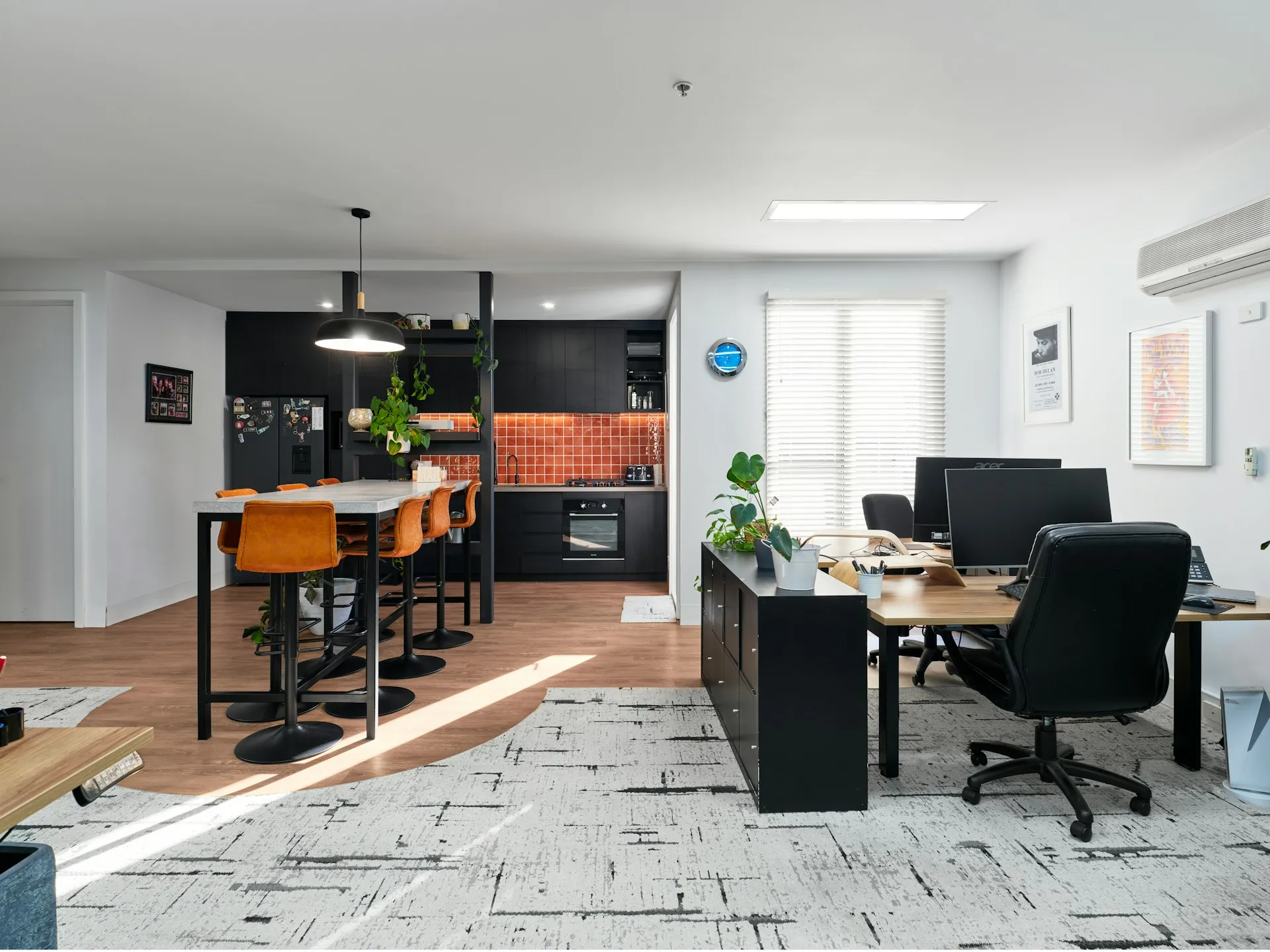 A dynamic office space where clean lines meet expressive details in creative tension. Rich velvet seating and carefully curated art punctuate an open layout, while bold color accents energize zones designed for both focused work and collaborative exchange.