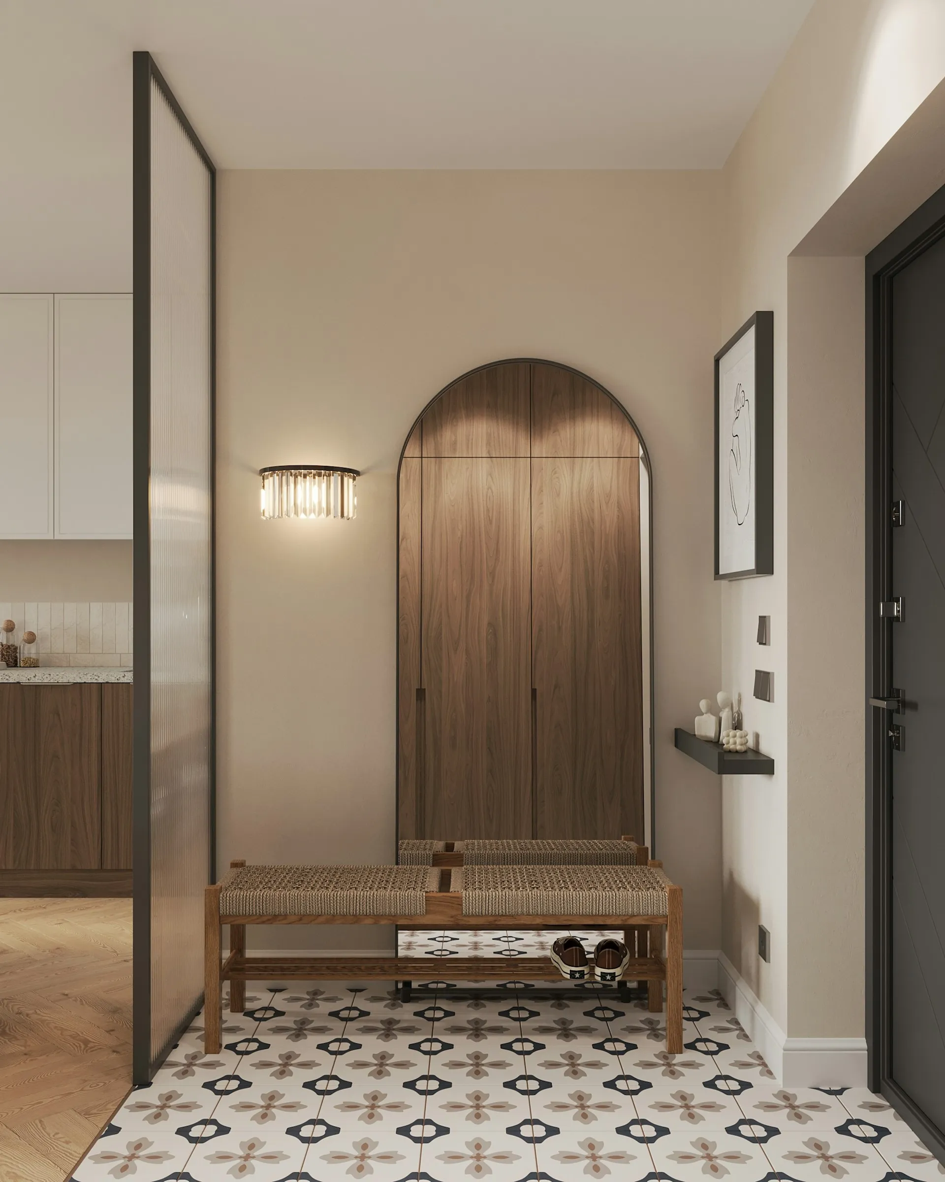 A refined apartment where olive tones meet warm oak in quiet harmony. Soft lighting enhances textured materials, while clean lines create visual calm. The result is a modern space that feels both effortlessly functional and genuinely intimate.